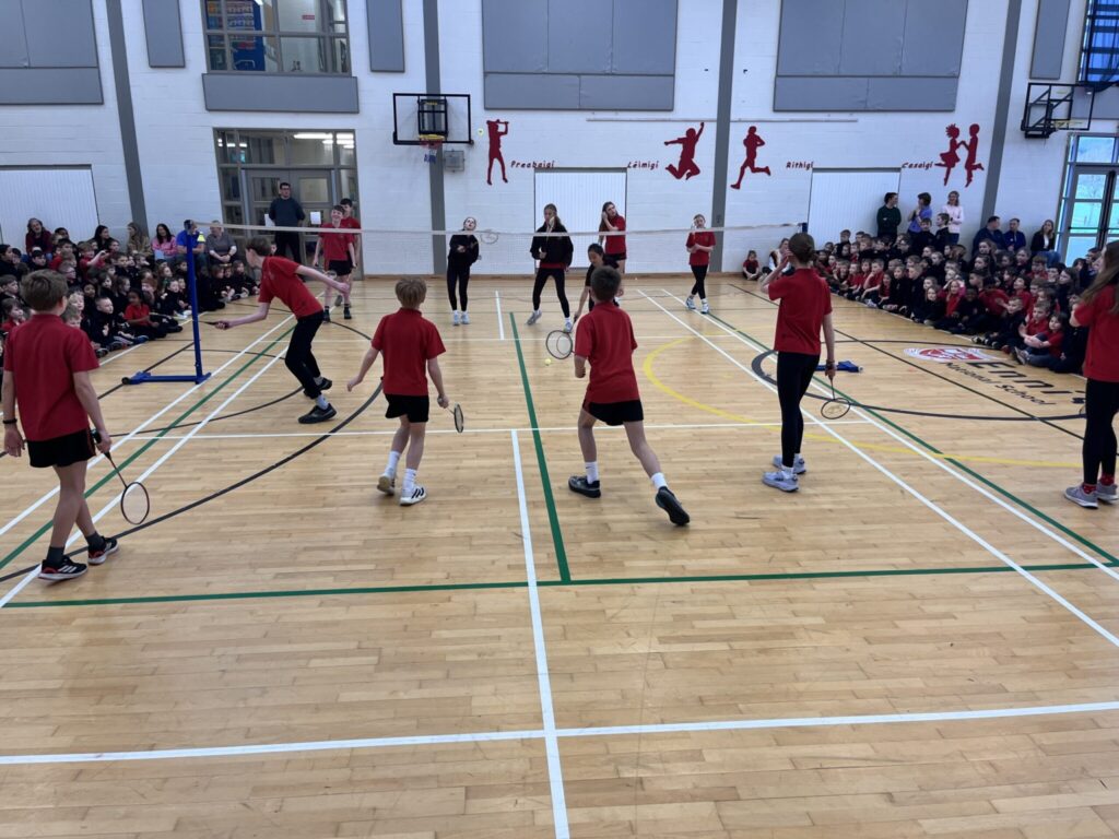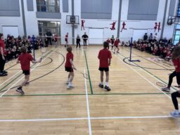 Following the presentations, the players treated the audience to a series of demonstration exhibition games, showcasing their impressive badminton skills. The rallies, quick reactions and powerful shots brought great excitement to the hall, with pupils cheering enthusiastically throughout.