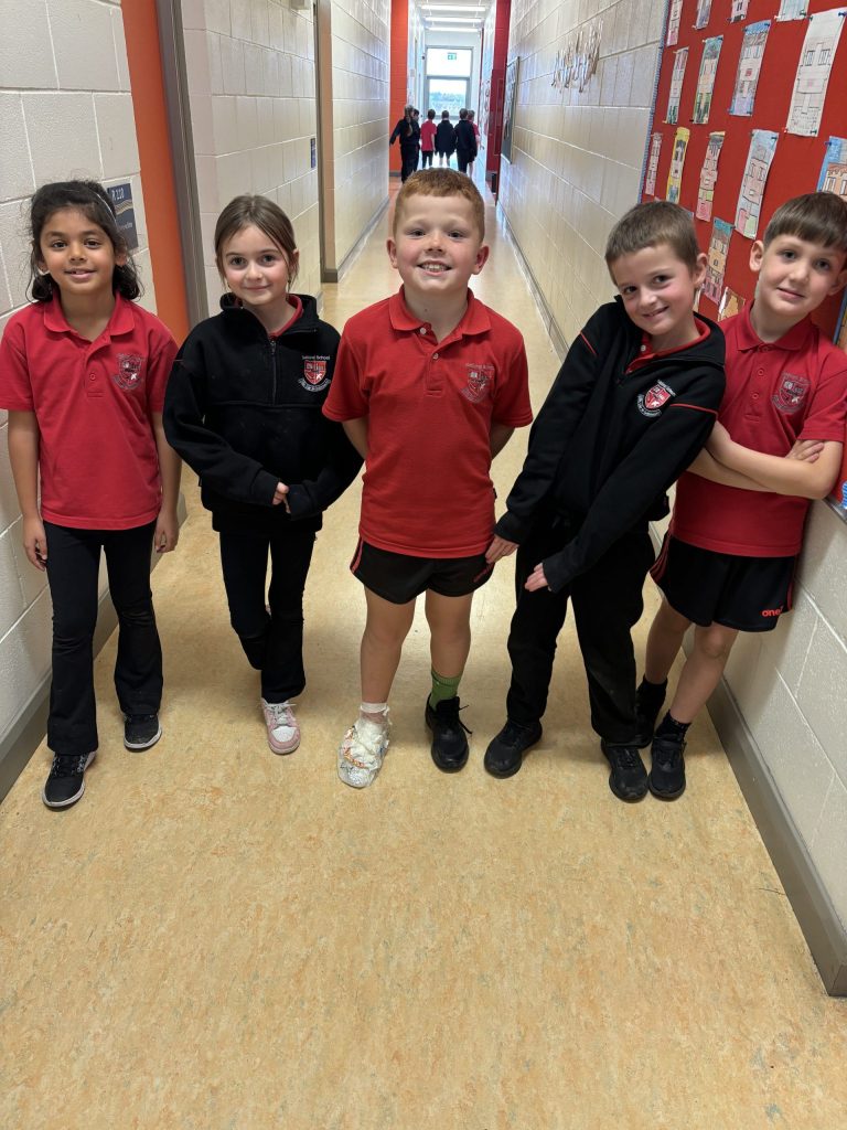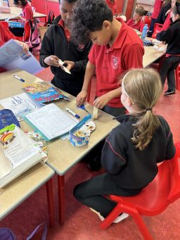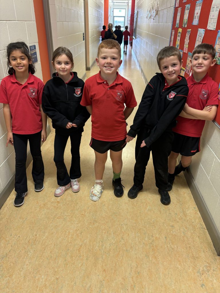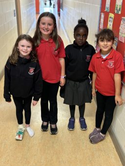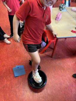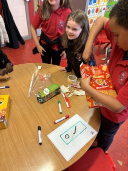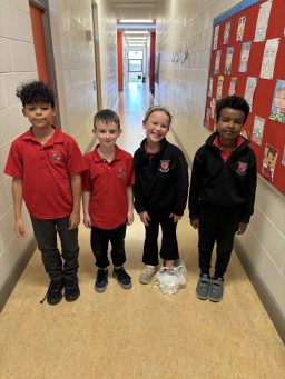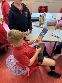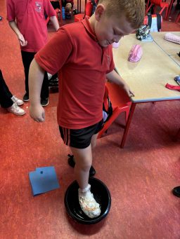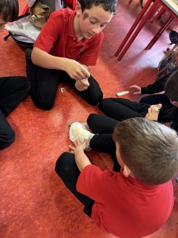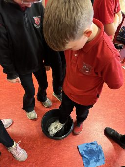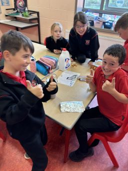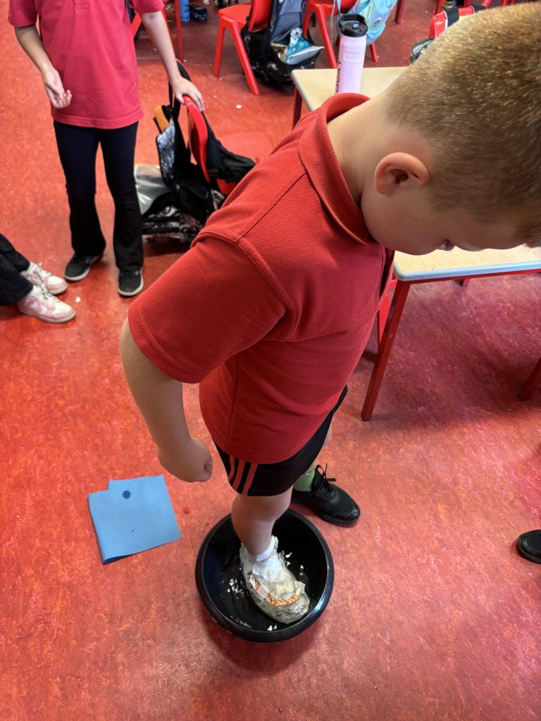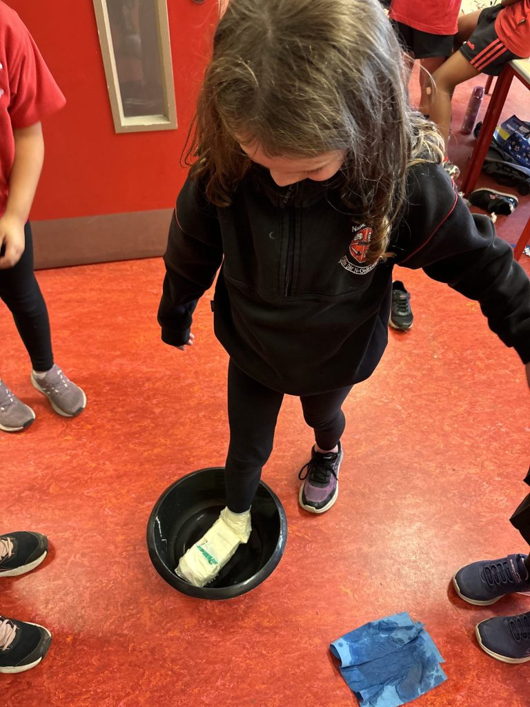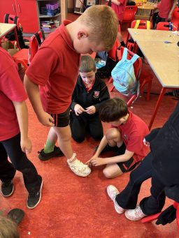 In second class, we were learning about materials and their properties last week. We experimented to see which materials were waterproof or absorbent. Using a previous lesson from Michael Browne on designing a shoe, in groups, the children had to design a shoe from recycled materials. The shoe had to fit one member of the group, be able to be worn on a walk down the corridor and finally proven to be waterproof when stood in water.