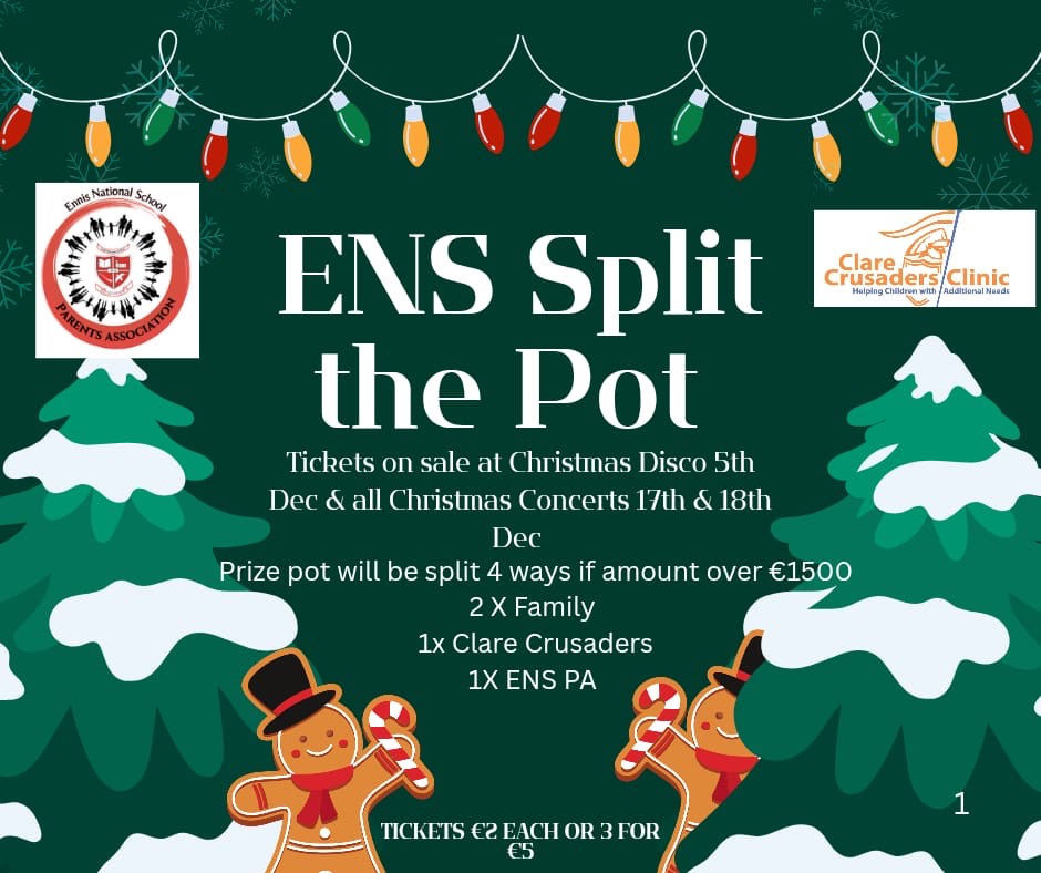 The split the pot raffle is back! The parents’ association will sell tickets for the raffle at the Christmas disco on Friday 5th, and also at all the Christmas shows on the 17th & 18th of December. Tickets are €2 each or 3 for €5. The pot will be split 3 ways if below €1500 (4 ways if above). 1 or 2 family winners, a donation to Clare Crusaders and a portion to the PA. Lucky winning ticket(s) will be drawn after the 4th class Christmas show (video posted to socials for those who miss it!).