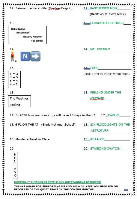 Congratulations to the Judge Family on winning our Quizmas competition. We were absolutely delighted with the feedback from all who participated in this novel event. Huge thanks to Ciara Stack and Anna Lordan for coming up with the idea and for organising the competition. Thanks also to all the staff who assisted them. We can now put your minds at ease and share the answers with you!